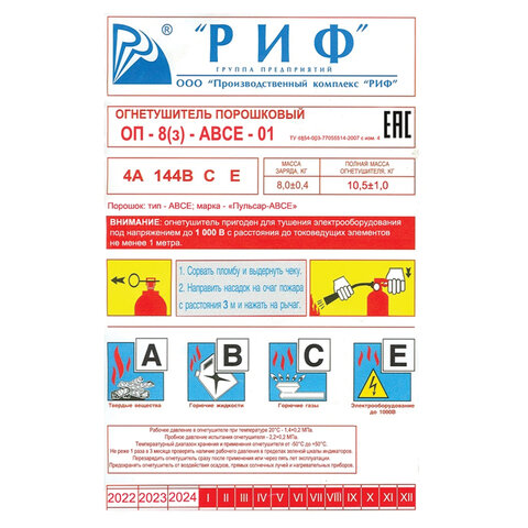 Огнетушитель порошковый ОП-8, АВСЕ (твердые, жидкие, газообразные, электрические) закачной, индивидуальный короб, РИФ