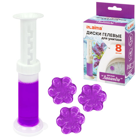 Диски гелевые, освежитель и очиститель для унитаза / писсуара, 8 дисков 44 г, LAIMA, "Лаванда", шприц, 609794