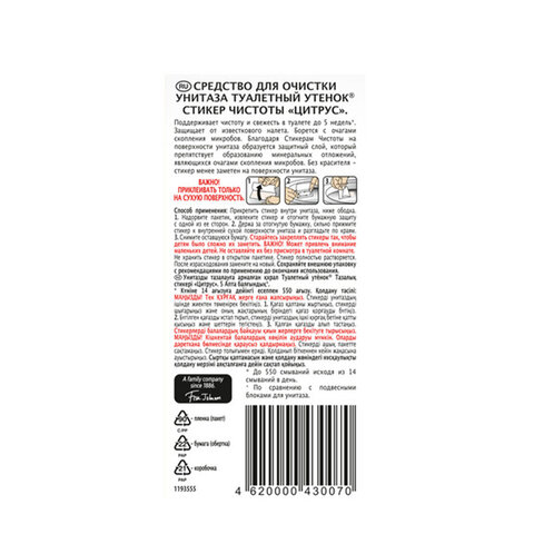 Стикеры чистоты "Цитрус" ТУАЛЕТНЫЙ УТЕНОК поддерживают чистоту и свежесть в туалете до 5 недель. Защищают от известкового налета, борются с очагами скопления микробов.