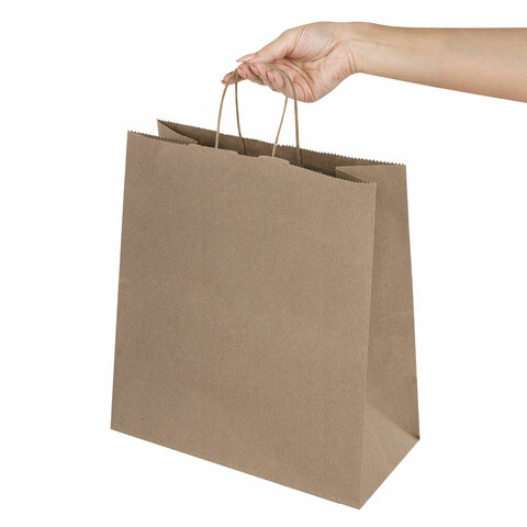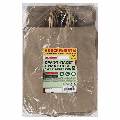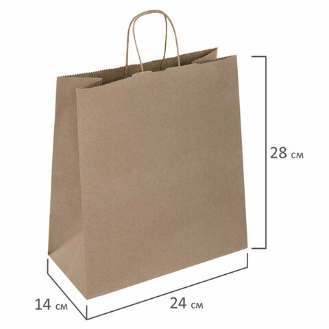 Крафт-пакет бумажный 24х14х28 см, КОМПЛЕКТ 50 шт., крученые ручки, плотность 90 г/м2, LAIMA ECO CRAFT, 609685