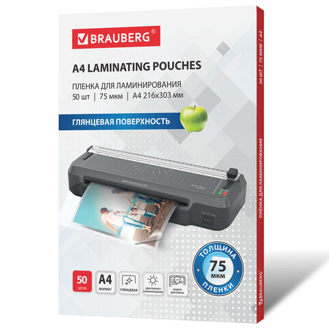 Пленки-заготовки для ламинирования А4, КОМПЛЕКТ 50 шт., 75 мкм, BRAUBERG, 533112