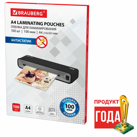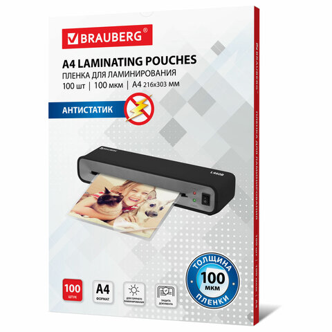 Пленки-заготовки для ламинирования АНТИСТАТИК, А4, КОМПЛЕКТ 100 шт., 100 мкм, BRAUBERG, 531793