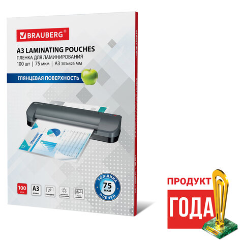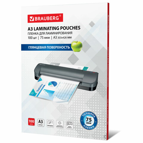 Пленки-заготовки для ламинирования БОЛЬШОГО ФОРМАТА, А3, КОМПЛЕКТ 100 шт., 75 мкм, BRAUBERG, 530894