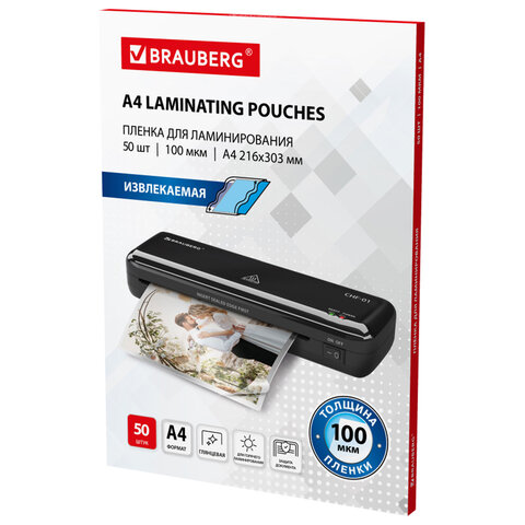 Пленки-заготовки для ламинирования ИЗВЛЕКАЕМЫЕ А4, КОМПЛЕКТ 50 шт., 100 мкм, BRAUBERG, 533118