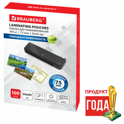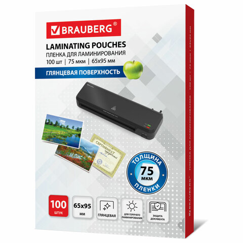 Пленки-заготовки для ламинирования МАЛОГО ФОРМАТА (65х95 мм), КОМПЛЕКТ 100 штук, 75 мкм, BRAUBERG, 531791