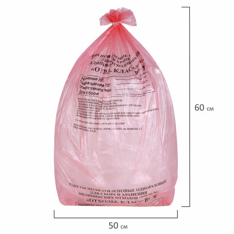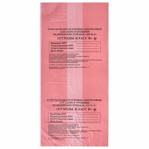 Пакеты для медицинских отходов КОМПЛЕКТ 100 шт., класс В (красные) 30 л, 50х60 см,10 мкм, ПТП "Киль"