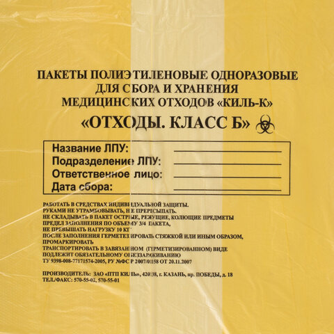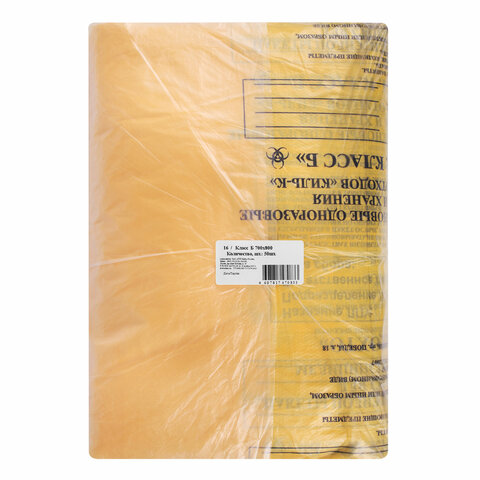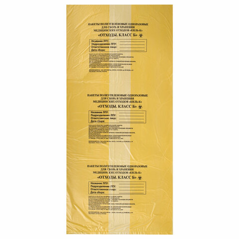 Пакеты для медицинских отходов КОМПЛЕКТ 50 шт., класс Б (желтые) 60 л, 70х80 см, 16 мкм, ПТП "Киль"
