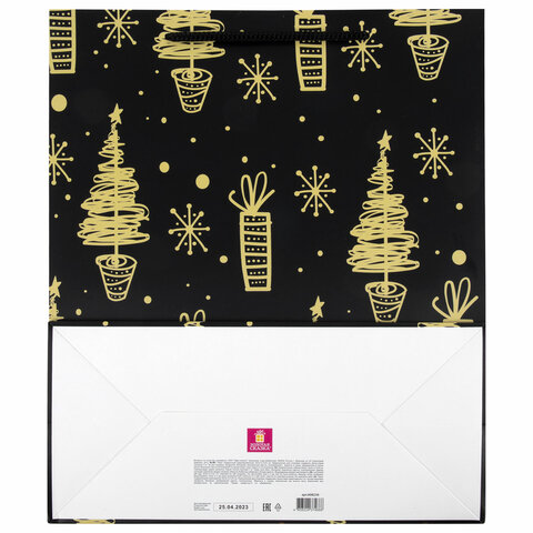 Подарочный новогодний пакет "Black&Gold" ЗОЛОТАЯ СКАЗКА – отличное решение для упаковки любого презента, которое позволит легко и со вкусом оформить выбранный подарок. Изготовлен из мелованного картона и снабжен веревочными ручками из полипропилена.