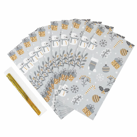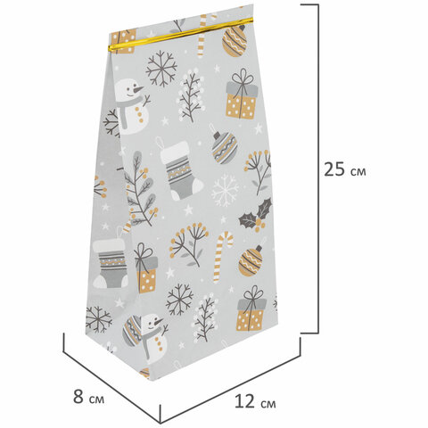 Пакет подарочный КОМПЛЕКТ 10 штук новогодний 12х8х25 см с зажимами, "Паттерн № 1", ЗОЛОТАЯ СКАЗКА, 592122