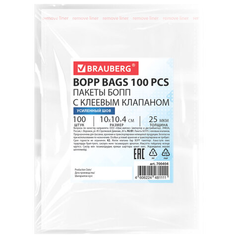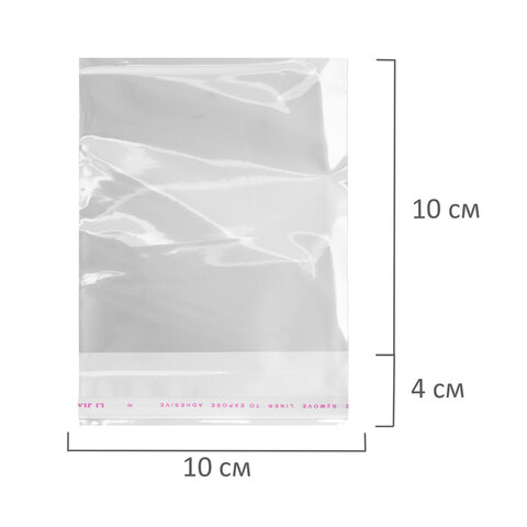 Пакеты БОПП с клеевым клапаном, КОМПЛЕКТ 100 штук, 10х10 + 4 см, 25 мкм, с усиленным швом, BRAUBERG, 700404