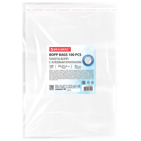 Пакеты БОПП с клеевым клапаном, КОМПЛЕКТ 100 штук, 20х25 + 4 см, 30 мкм, с усиленным швом, BRAUBERG, 700407