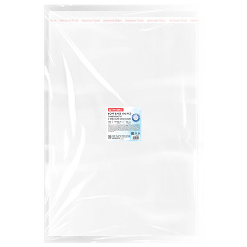 Пакеты БОПП с клеевым клапаном, КОМПЛЕКТ 100 штук, 40х60 + 4 см, 30 мкм, с усиленным швом, BRAUBERG, 700412