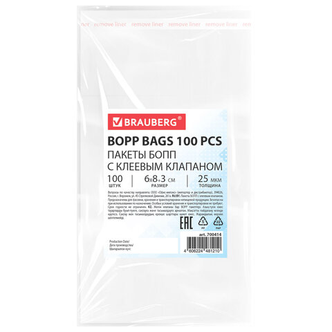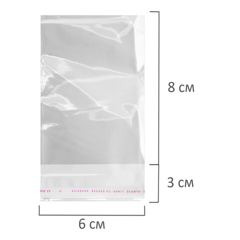 Пакеты БОПП с клеевым клапаном, КОМПЛЕКТ 100 штук, 6х8 + 3 см, 25 мкм, BRAUBERG, 700414