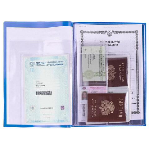 Папка для семейных документов с файлами (паспорта, свидетельства, полисы, СНИЛС) STAFF, 16 отделений, ПВХ, синяя, 237806