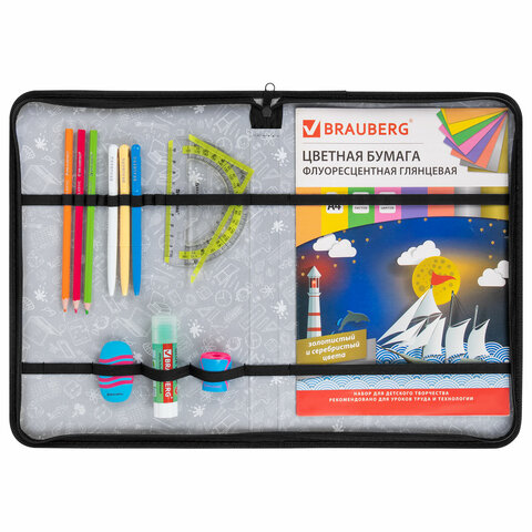 Папка на молнии BRAUBERG с ручкой и органайзером. Внутри папки – крепления для канцелярских и письменных принадлежностей. Застежка-молния расположена по периметру папки.