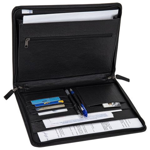 Распашная деловая папка из кожзаменителя на молнии. Одно объемное отделение и два плоских кармана. Дополнительный карман на молнии. Отделения для визиток и письменных принадлежностей.