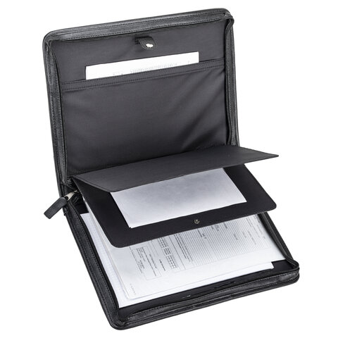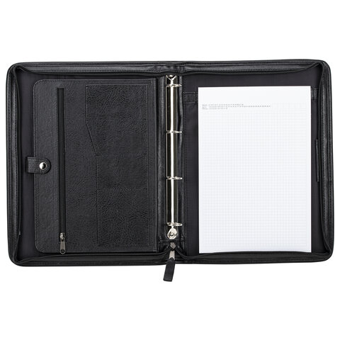 Распашная деловая папка на молнии снабжена объемным карманом на кнопке, плоским карманом на молнии и карманом для блокнота. Дополнительные отделения для визиток и пишущих принадлежностей. 4-кольцевой механизм для перфорированных папок.