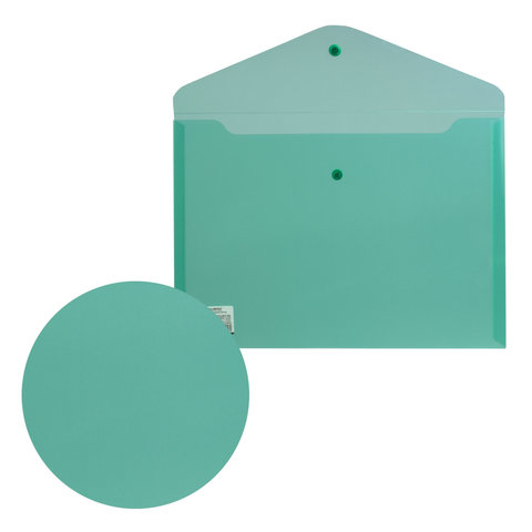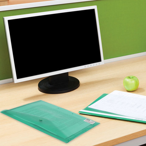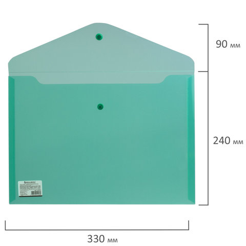 Папка-конверт с кнопкой BRAUBERG, А4, до 100 листов, прозрачная, зеленая, СВЕРХПРОЧНАЯ 0,18 мм, 224810