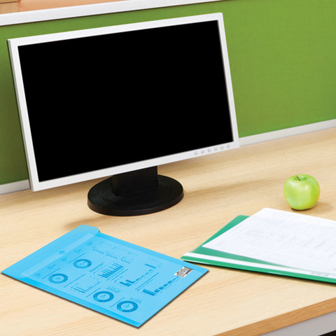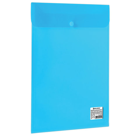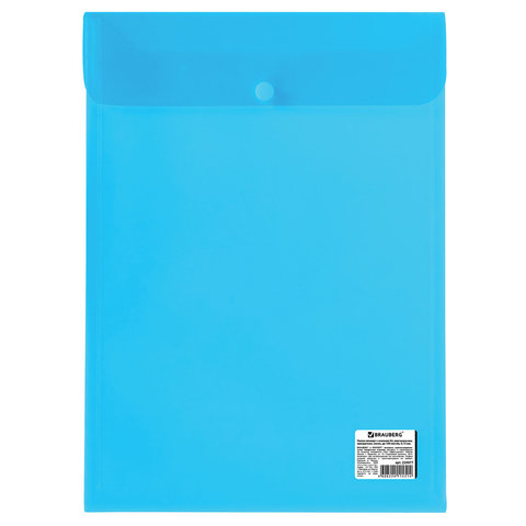 Папка-конверт с кнопкой BRAUBERG, вертикальная, А4, до 100 листов, прозрачная, синяя, 0,15 мм, 224977