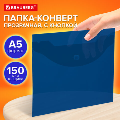 Папка-конверт с кнопкой прозрачная МАЛОГО ФОРМАТА, А5, BRAUBERG "UNIVERSAL", синяя, 0,15 мм, 273066