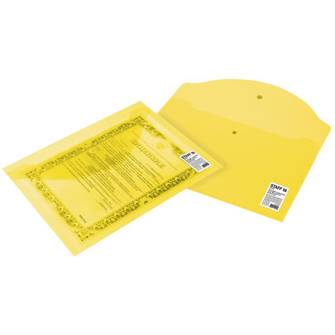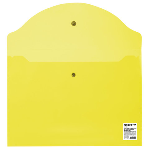 Папка-конверт с кнопкой STAFF, А4, до 100 листов, прозрачная, желтая, 0,12 мм, 226031