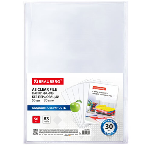 Папки-файлы БЕЗ ПЕРФОРАЦИИ, БОЛЬШОГО ФОРМАТА А3 для хранения и защиты документов, BRAUBERG, КОМПЛЕКТ 50 шт., гладкие, 30 мкм, 273012