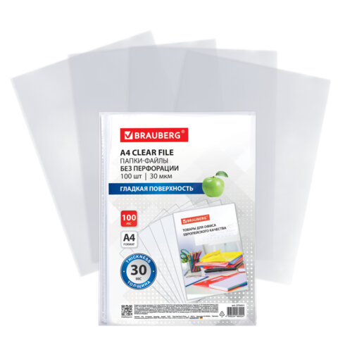 Папки-файлы БЕЗ ПЕРФОРАЦИИ для хранения и защиты документов А4 BRAUBERG, КОМПЛЕКТ 100 шт., гладкие, 30 мкм, 273011