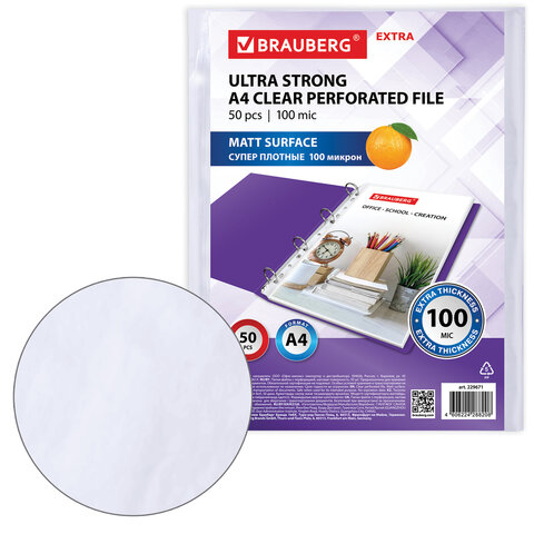 Папки-файлы перфорированные А4 BRAUBERG "EXTRA 1000", КОМПЛЕКТ 50 шт., матовые, ПЛОТНЫЕ, 100 мкм, 229671