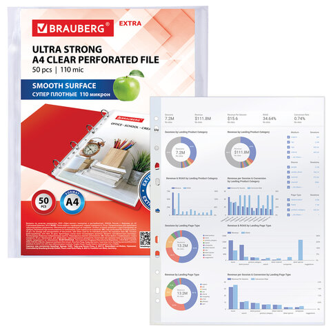 Перфорированные папки-файлы BRAUBERG "EXTRA 1100" предназначены для хранения документов в папке с любым кольцевым механизмом или скоросшивателем.