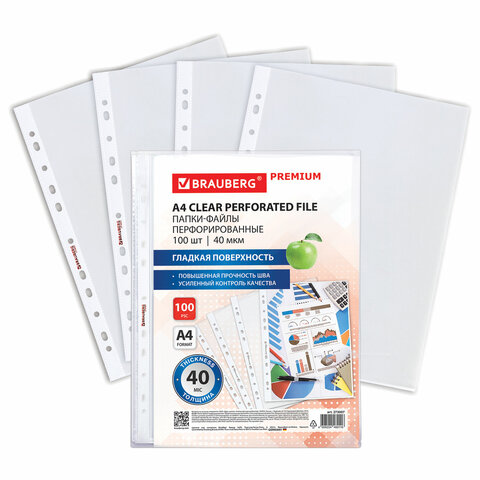 Папки-файлы перфорированные А4 BRAUBERG "PREMIUM", КОМПЛЕКТ 100 шт., гладкие, 40 мкм, 273007