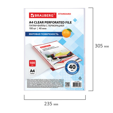 Папки-файлы перфорированные А4 BRAUBERG "STANDARD", КОМПЛЕКТ 100 шт., матовые, 40 мкм, 229660