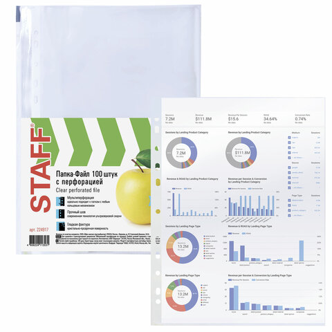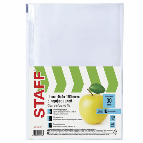 Папки-файлы перфорированные, А4, STAFF "STANDARD", КОМПЛЕКТ 100 шт., гладкие, "Яблоко", 30 мкм, 224917