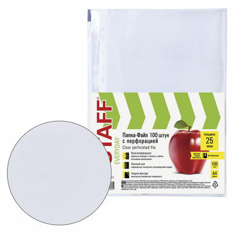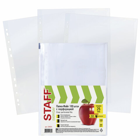 Папки-файлы перфорированные, А4, STAFF "STANDARD", КОМПЛЕКТ 100 шт., гладкие, 25 мкм, 224814