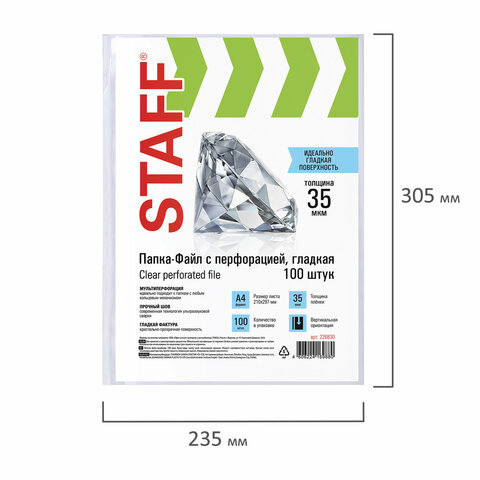 Папки-файлы перфорированные, А4, STAFF "ЭКОНОМ", КОМПЛЕКТ 100 шт., гладкие, 35 мкм, 226830