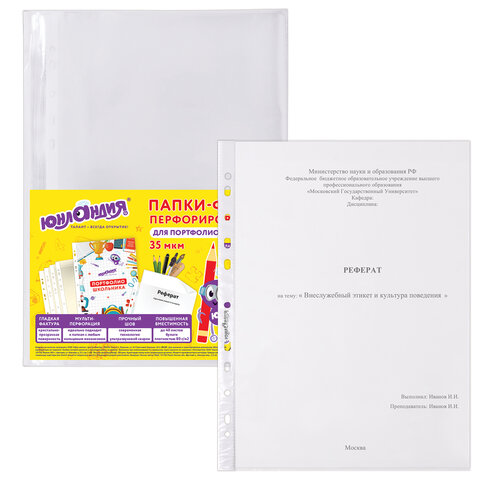 Перфорированные папки-файлы ЮНЛАНДИЯ предназначены для хранения документов в папке с любым кольцевым механизмом или скоросшивателем.
