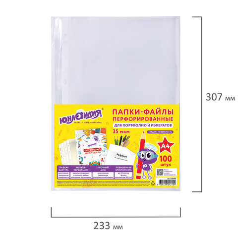 Папки-файлы перфорированные А4 ЮНЛАНДИЯ, КОМПЛЕКТ 100 шт., гладкие, 35 мкм, 228680