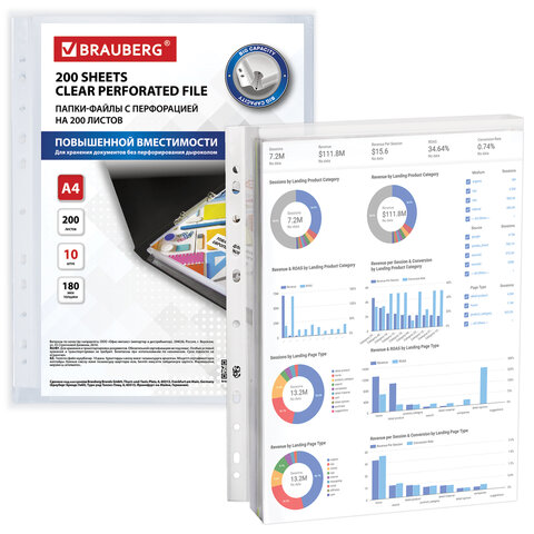 Перфорированные папки-файлы BRAUBERG большой вместимости предназначены для использования в архивных папках. Папка расширяется до 20 мм по бокам и снизу, что способствует хранению большого объема документов, каталогов, презентаций.