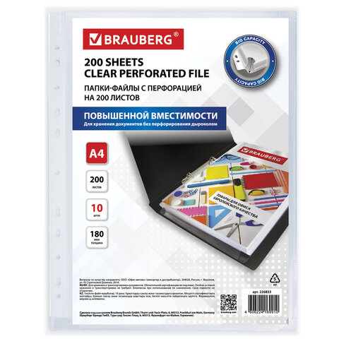 Папки-файлы перфорированные БОЛЬШОЙ ВМЕСТИМОСТИ до 250 л., А4, КОМПЛЕКТ 10 шт., 180 мкм, BRAUBERG, 226833