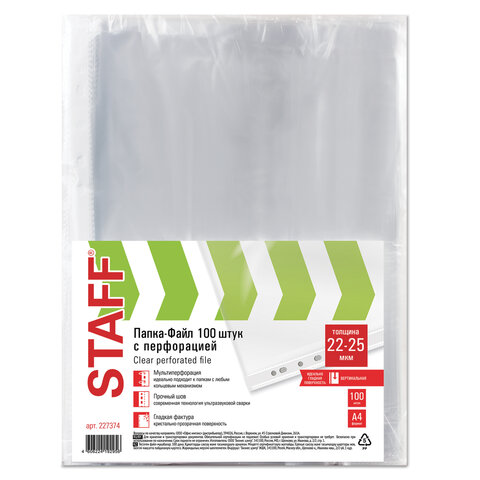 Папки-файлы перфорированные А4 STAFF "ЭКОНОМ", КОМПЛЕКТ 100 шт., гладкие, 22 - 25 мкм, 227374