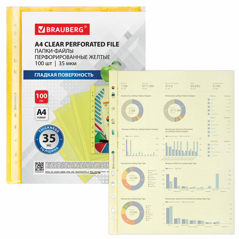 Папки-файлы перфорированные ЖЕЛТЫЕ А4 BRAUBERG, комплект 100 шт., гладкие, 35 мкм, 272678