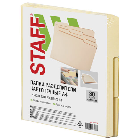 Папки-разделители картотечные А4, КОМПЛЕКТ 30 шт., 295х240 мм, бежевые, STAFF, 270938
