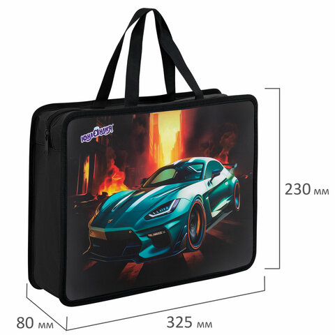 Папка на молнии с ручками ЮНЛАНДИЯ А4, 1 отделение, пластик, 80 мм, "Fire car", 272155