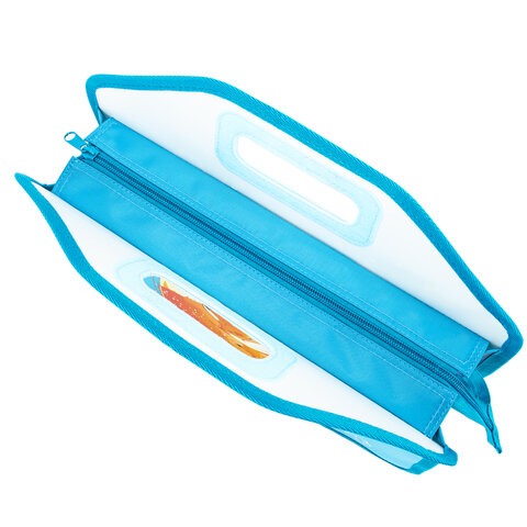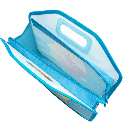 Папка-сумка на молнии с ручками ЮНЛАНДИЯ выполнена из пластика, имеет уплотненные фетром двойные ручки в корпусе, по по краям окантована тканью. Застежка-молния расположена по верхнему краю папки.