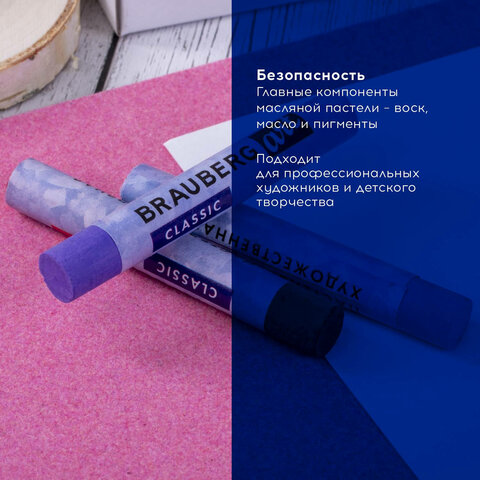 Масляная художественная пастель BRAUBERG ART "Classic" отличается мягкой консистенцией и интенсивной маслянистой цветовой палитрой. Пастель не пачкается, тем самым законченные рисунки труднее смазать и они не требуют дополнительной фиксации.