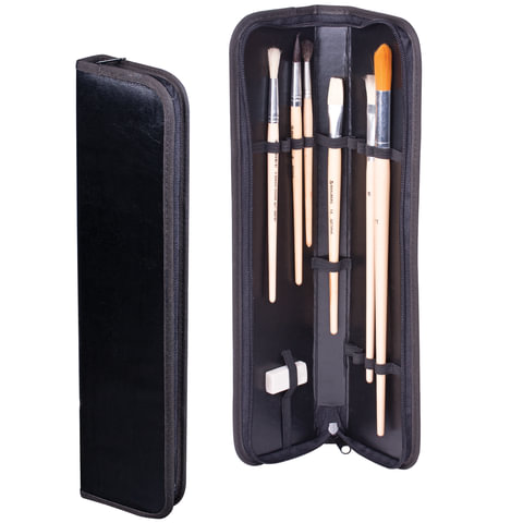Стильный пенал, выполненный из искусственной кожи, предназначен для хранения и транспортировки кистей. Кисти фиксируются резинкой на местах крепления.