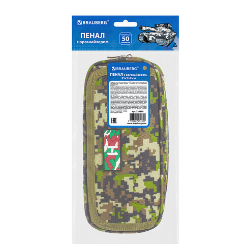 Пенал BRAUBERG для мальчиков, 1 отделение, органайзер, мягкий, "Military", зеленый, 21х5х9 см, 228990