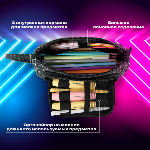 Мягкий пенал BRAUBERG MOMENTS треугольной формы с откидной планкой выполнен из прочного полиэстера-канваса. Вмещает до 70 предметов.