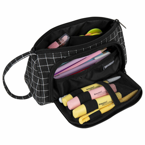 Пенал-косметичка BRAUBERG с ручкой, 1 откидная планка, полиэстер, 22x10х8 см, "Checkered black", 271559