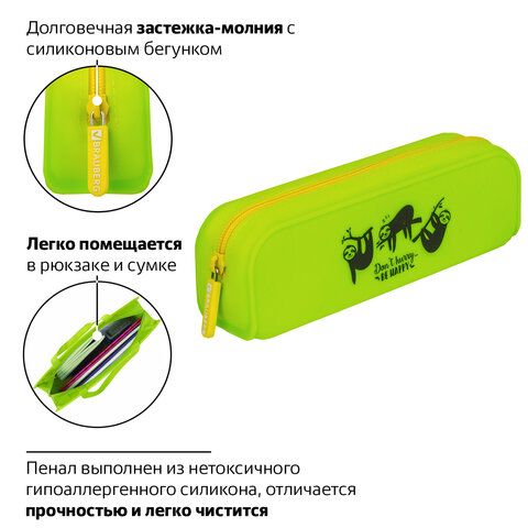 Пенал-косметичка BRAUBERG "Sloths" выполнен из нетоксичного гипоаллергенного силикона с эффектом Soft Touch. Контрастная молния оснащена силиконовым бегунком с логотипом. Вмещает до 50 канцелярских предметов стандартного размера.