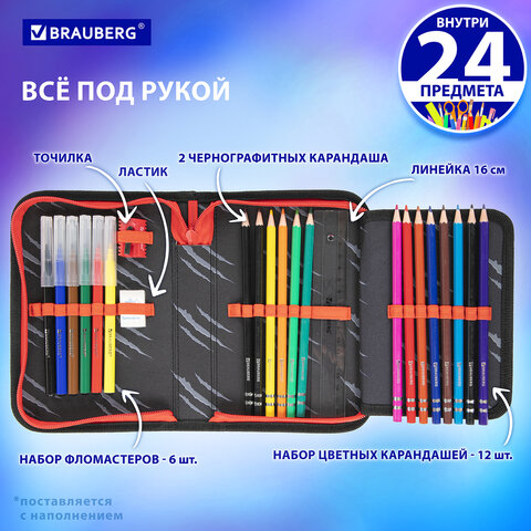 Тканевый пенал BRAUBERG стандартного размера с одним отделением и одной откидной планкой. Удобная молния с трех сторон с металлическим бегунком, прочные резинки для предметов. Пенал с наполнением включает 24 предмета.
